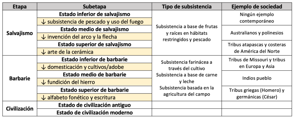 Para concretar un poco más, cabe señalar que la etapa de salvajismo y de barbarie se subdividen a su vez en tres estados: inferior, medio y superior; y la última etapa de civilización se divide -siempre según la teoría de Morgan- en civilización antigua y civilización moderna. El descubrimiento y uso de cierta tecnología es lo que hace que las sociedades evolucionen de una etapa a la inmediatamente superior; por ejemplo, la invención del arco y la flecha es lo que diferencia el estado medio y el estado superior de salvajismo.